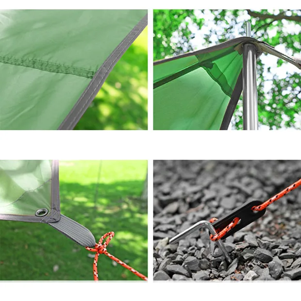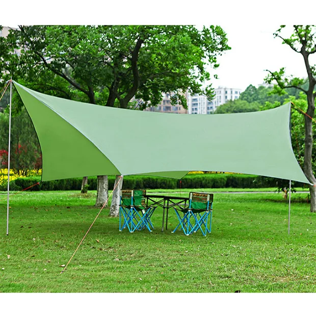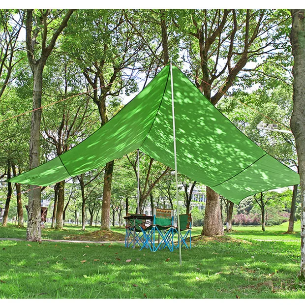 Ang Outdoor Tarp Shelter ay isang panlabas na hindi tinatablan ng tubig na tarp na idinisenyo upang magbigay ng proteksyon para sa mga panlabas na aktibidad, kamping at mga hiker. Ang mga materyales ng tarp na ito ay idinisenyo upang itaboy ang ulan, hangin, at UV ray, na ginagawa itong lubos na maaasahan at matibay sa mga panlabas na kapaligiran. Ang disenyo ng Outdoor Tarp Shelter ay ginagawa itong angkop para sa iba't ibang iba't ibang estilo at kapaligiran upang matugunan ang iba't ibang panlabas na pangangailangan ng mga user. Madaling i-install at alisin ang Outdoor Tarp Shelter, na nagbibigay ng takip at takip nang mabilis. Ang panlabas na silungan na ito ay madaling dalhin sa iyong mga bagahe at ito ang perpektong pagpipilian kung ikaw ay isang taong mahilig sa labas ng bahay o isang taong paminsan-minsan lamang na nag-e-explore at nagkakamping. Ang Panlabas na Tarp Shelter ay dapat na idinisenyo para sa mga aktibidad sa labas. Maaari nitong matiyak ang kaginhawahan at kaligtasan sa panlabas na kapaligiran, habang nagbibigay din ng isang maginhawa, matibay at praktikal na mahahalagang accessory para sa mga mahilig sa labas.
