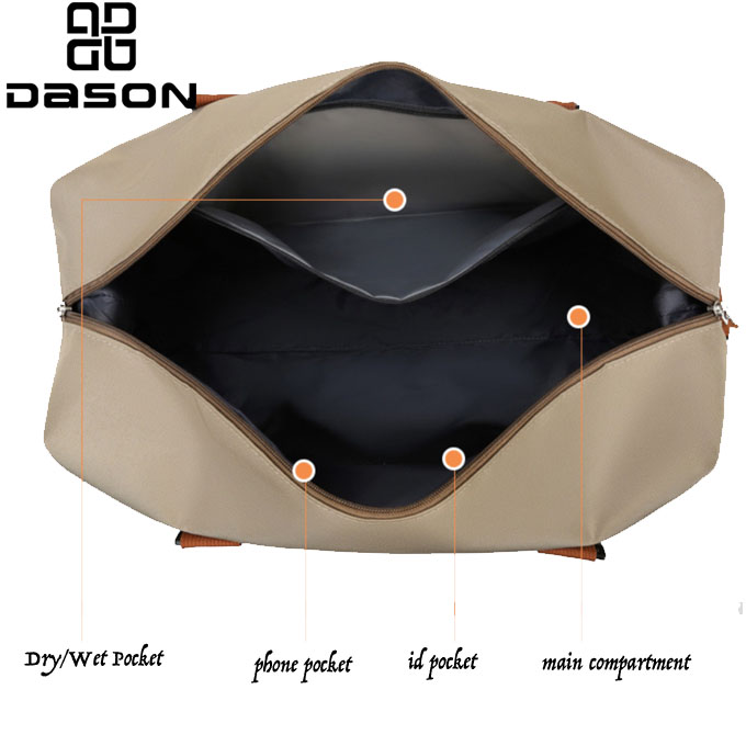 Pangunahing kompartamento ng aming disenyo ng duffel bag sa paglalakbay na may isang tuyo na basang bulsa upang matulungan kang paghiwalayin ang mga tuyo/basang bagay tulad ng mga damit o tuwalya